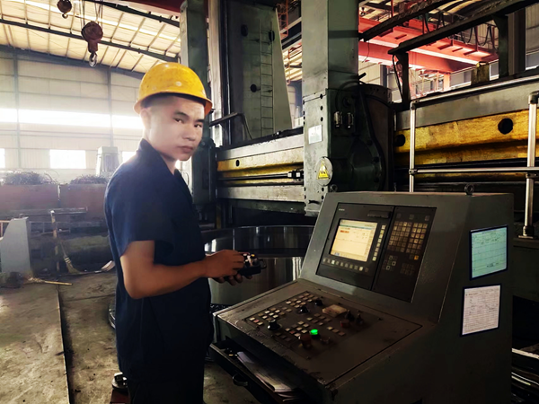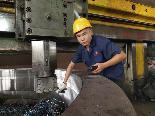 他为人憨厚老实,吃苦耐劳,服从安排,任劳任怨,做事专注细致,被张主任看在眼里记在心里。因此当8米立车一名师傅辞职后,他便按照“量才配岗”的原则,立即把赵江调到立车岗位,每天亲自教他操作立车。通过他的严格要求,加上赵江坚持不懈的努力,他终于熟练掌握了立车的操作技术。如今,他在立车岗位上己经做了两年,前后己带了两位徒弟。每当同事夸他上手快时,他却觉得自己的技术离师傅还有很大差距。“纸上学来终觉浅,绝知此事要躬行。张主任的亲自教导、我从书本上自学来的知识,自己按条条框框操作,这是打基础。领悟了图纸的加工要求后,在保证质量的前提下,编写好程序、各项参数、速度(包括进给速度和转速)后,我还必须随时观察车床上的一举一动,监管加工全过程,在工作实践中不断发现问题、思考问题、解决问题、总结经验。当我能对具体问题具体分析具体解决并游刃有余时,我就从操作工变成师傅了,”赵江说。